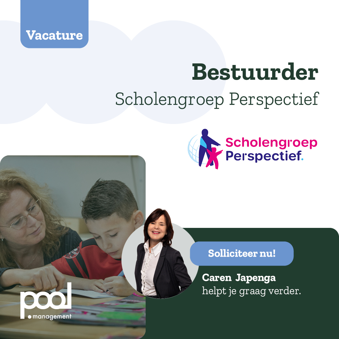 Wij zijn op zoek naar een nieuwe bestuurder. Welke verbindende en besluitvaardige bestuurder bouwt vanuit visie en samen met alle betrokkenen verder aan een perspectief-rijke toekomst voor alle kinderen van Scholengroep Perspectief? De sollicitatieprocedure verloopt via Pool Management. Graag verwijzen wij door naar hen voor informatie en sollicitatie https://www.pool-management.nl/vacature-detail/bestuurder-aqhz57b4hrzgoxdc/